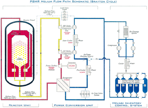 Entre-temps, l'évolution des techniques, notamment dans la métallurgie, dans les paliers secs à gaz et les matériaux réfractaires, a remis en selle la réaction à haute température. La société General Atomics, alliée à un consortium japonais, français et russe, travaille sur un HTR «tout hélium» de 300 mégawatts. Ce réacteur aux éléments combustibles compacts prismatiques fonctionne selon le cycle de Brayton. L'hélium chaud se détend dans une turbine à gaz couplée à un compresseur, qui le renvoie dans le cœur.