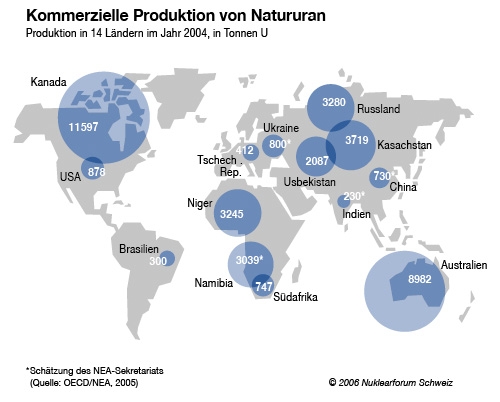 Entsprechend hat die Natururanproduktion zwischen 2002 und 2004 insgesamt um fast 12% zugenommen. Die höchsten Steigerungsraten von über 30% verzeichneten Australien, Kasachstan und Namibia.