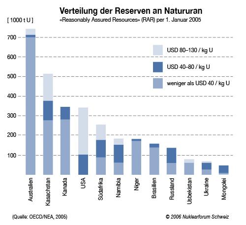 Gemäss dieser alle zwei Jahre erscheinenden und als «Red Book» bekannten Zusammenstellung der offiziellen Daten von 43 Ländern beliefen sich die weltweit zu einem Preis von bis zu USD 130 pro kg Uran abbauwürdigen Reserven («Reasonably Assured Resources», RAR) am 1. Januar 2005 auf rund 3,3 Mio. t (siehe Grafik). Dazu kommen noch gut 1,4 Mio. t so genannte «Inferred Resources», die noch nicht umfassend genug exploriert sind, um als RAR klassifiziert zu werden (bisher als EAR-I, «Estimated Additional Resources Category I» bezeichnet). Insgesamt belaufen sich demnach die kommerziellen Uranreserven auf rund 4,7 Mio. t. Dies ist etwas mehr, als bei der Erhebung im Jahr 2003 von den Förderländern gemeldet worden war (4,6 Mio. t). Der Spotmarktpreis stand Ende Juli 2006 bei rund USD 135/kg U.