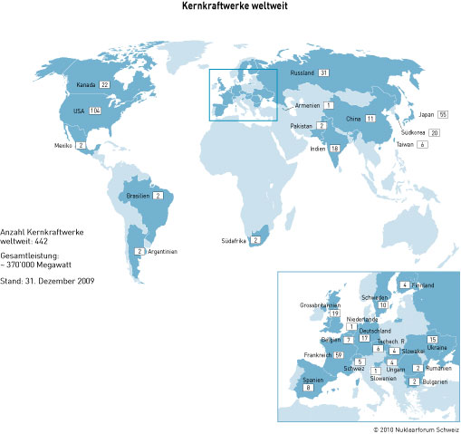 Ende 2009 umfasste der zivile Nuklearpark der Welt 442 Kernkraftwerksblöcke in 30 Ländern, wovon fünf für längere Zeit ausser Betrieb gesetzt sind. Zwei Kernkraftwerke nahmen 2009 den kommerziellen Betrieb auf, Rajasthan-5 in Indien und Tomari-3 in Japan. Beim Jahrswechsel befanden sich total 53 Kernkraftwerksblöcke im Bau, wovon elf im Jahr 2009 den offiziellen Baubeginn feierten. Weltweit sind rund 100 neue Kernkraftwerksblöcke geplant. Im vergangenen Jahr waren zudem drei Stilllegungen zu verzeichnen: Ignalina-2 in Litauen und Hamaoka-1 und -2 in Japan. Zudem wurde in Frankreich die Stromproduktion des Schnellen Brüters Phénix eingestellt. Die Anlage soll 2010 stillgelegt werden. Insgesamt verringerte sich die elektrische Gesamtnettoleistung des weltweiten Nuklearparks geringfügig von rund 374’000 auf 370’000 MW.