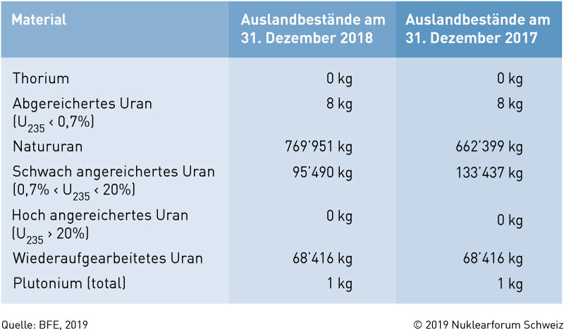 Seit Inkrafttreten des Kernenergiegesetzes und der Safeguardsverordnung müssen alle Kernmaterialbestände im Ausland, die sich in Schweizer Eigentum befinden, jährlich den Aufsichtsbehörden gemeldet werden. Das Bundesamt für Energie (BFE) hat am 26. März 2019 die Bestandszahlen für 2018 veröffentlicht.