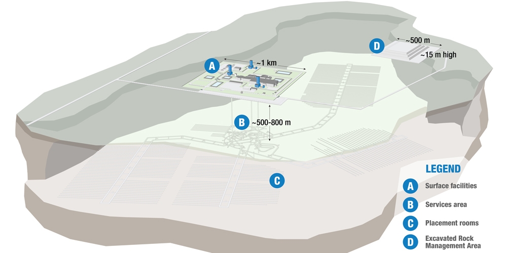 - Le dépôt profond finlandais d’Onkalo, sur la presqu’île d’Olkiluoto – considéré par le directeur général de l’Agence internationale de l’énergie atomique (AIEA) Rafael Mariano Grossi comme un projet précurseur pour la durabilité de l'énergie nucléaire – est construit actuellement par l’organisation de gestion des déchets Posiva Oy. Les premiers déchets devraient être placés dans le dépôt au milieu des années 2020.