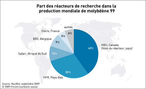 L’approvisionnement mondial en molybdène 99 (Mo-99) – respectivement en technétium 99 m (Tc-99-m), son isotope fille d’une importance déterminante pour la médecine nucléaire – a connu des difficultés de plus en plus sérieuses au cours de cette dernière décennie. La majeure partie du Mo-99 produit dans le monde provient de cinq réacteurs de recherche. Ces installations sont en service depuis 40 à 50 ans, et leur arrêt prolongé pour des travaux de maintenance est à l’ordre du jour. Des interruptions d’exploitation telles que celle du réacteur d’essai canadien des matériaux du combustible NRU (National Research Universal) de l’Energie Atomique du Canada Limitée (EALC), arrêt qui durera probablement jusqu’au printemps 2010, aggravent la situation d’autant plus. Les instances spécialisées du monde entier estiment que le maintien de l’exploitation des cinq réacteurs de recherche ne suffira pas à résoudre le problème à lui seul. C’est pourquoi l’on examine actuellement de nouvelles solutions pour garantir la couverture des besoins à moyen et à long termes.