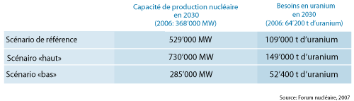 Le scénario de référence prévoit une augmentation des capacités de production nucléaire de 1,5% par an du fait de l'augmentation du parc nucléaire mondial (voir graphique), ce qui ferait passer cette capacité de 368'000 MW actuellement à 529'000 MW d'ici 2030. Etant donné toutefois que, selon les estimations de la WNA, la consommation d'électricité augmentera plus fortement d'ici 2030, le scénario de référence prévoit une baisse de la quote-part d'électricité nucléaire dans la production électrique globale. Avec ce scénario, la demande en uranium est évaluée à 109'000 tonnes d'uranium en 2030. Selon les calculs de la WNA, la demande mondiale en uranium des centrales nucléaires s'est élevée à 64'200 tonnes en 2006.
